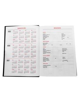 Esta elegante agenda 2026 de tapa dura modelo "París" en color negro es perfecta para quienes buscan organización y estilo en su día a día. Con un tamaño práctico de 21 x 15 cm, está diseñada en castellano y cuenta con un formato claro y funcional. Incluye una página con los calendarios de los años 2025, 2026 y 2027 para una visión completa de estos periodos, además de una sección para datos personales con campos para información importante como filiación, domicilio, vehículo, póliza de vida y contactos de emergencia.