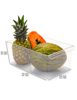 Mantén tus frutas y verduras perfectamente almacenadas y ordenadas dentro de la nevera con este fantástico cajón organizador reutilizable Nº 12 de plástico translúcido. Su tamaño hace que sea ideal para colocarlo dentro del frigorífico, en el congelador, en la despensa, etc. Además, incorpora un asa muy útil para moverlo cómodamente.