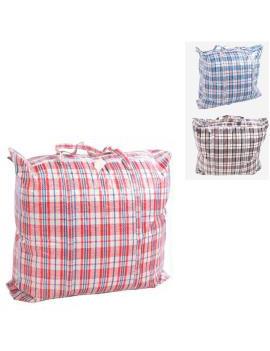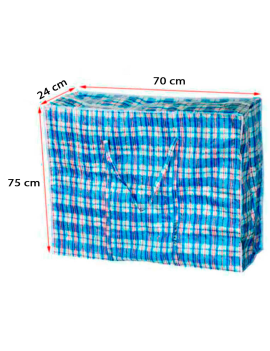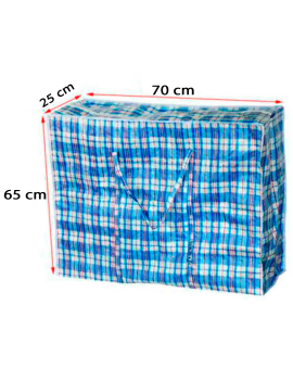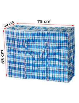 Esta bolsa plástica a cuadros de 80 x 65 x 25 cm es perfecta para guardar todo tipo de objetos como ropa, juguetes o mantas. También es ideal para mudanzas, ya que te permitirá transportar una gran cantidad de objetos gracias a su gran capacidad. Es reutilizable y cuenta con cierre de cremallera y asas grandes.