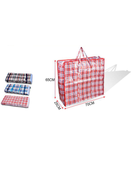 Esta bolsa plástica a cuadros de 70 x 65 x 25 cm es perfecta para guardar todo tipo de objetos como ropa, juguetes o mantas. También es ideal para mudanzas, ya que te permitirá transportar una gran cantidad de objetos gracias a su gran capacidad. Es reutilizable y cuenta con cierre de cremallera y asas grandes.
