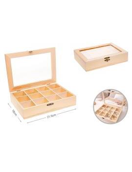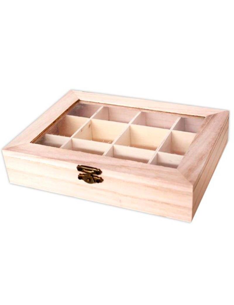 Esta bonita caja de madera con 12 compartimentos es ideal para guardar todo tipo de objetos pequeños como joyas, piedras preciosas, minerales, etc. Gracias a su tapa con cristal transparente podrás ver lo que hay en su interior sin tener que abrirla, por lo que sirve también como expositor. Cuenta con un cierre metálico de tipo broche.