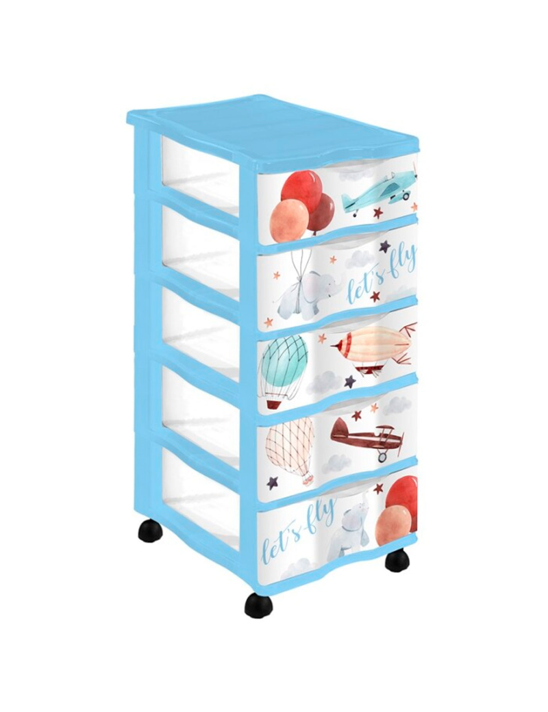 Preciosa cajonera infantil de 5 cajones y ruedas modelo "Let's Fly". Sus múltiples cajones permiten guardar varias cosas por separado y clasificarlas por tipo; y al ser transparentes también facilitan encontrar las cosas. No solo sirve para almacenar artículos de papelería, sino también para guardar juguetes, ropa, etc. Ideal para colocar en la sala de estar, dormitorio o estudio; las ruedas permiten moverla cómodamente de un lugar a otro.
