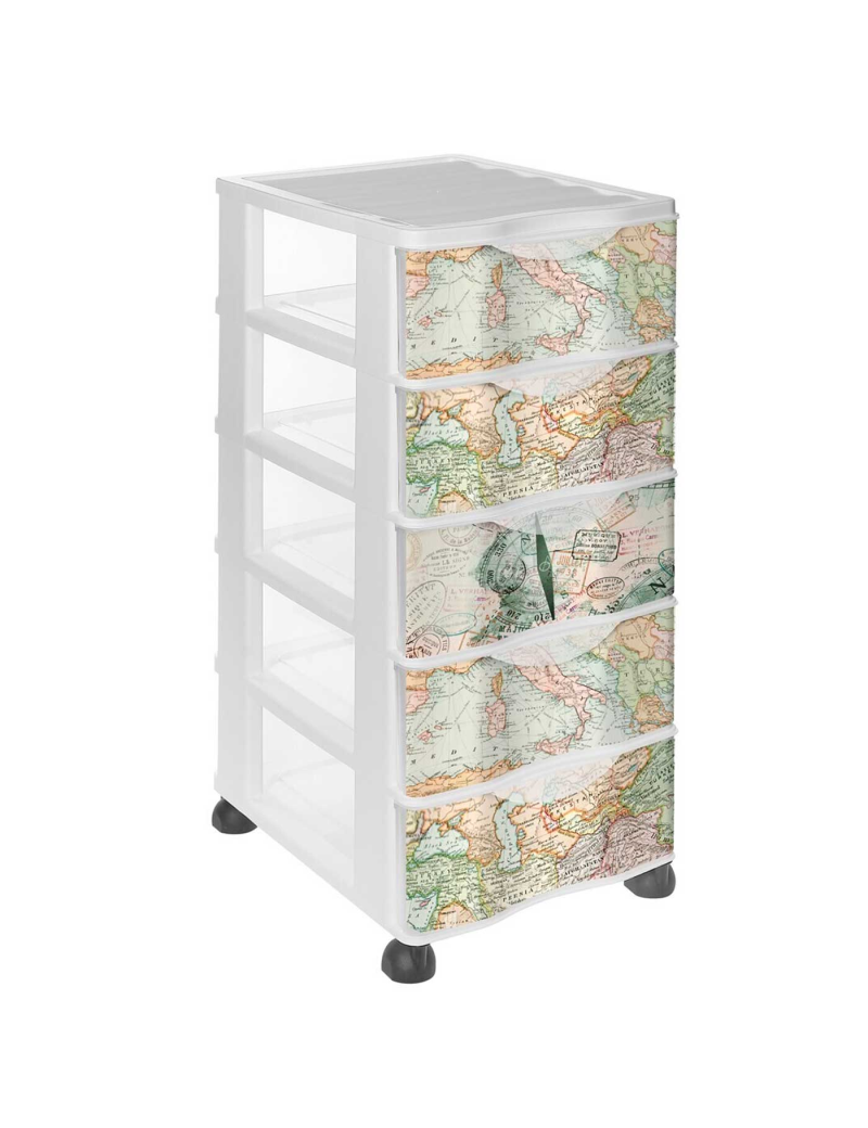 Preciosa cajonera infantil con ruedas y 5 cajones modelo Mapamundi. Sus múltiples cajones permiten guardar varias cosas por separado y clasificarlas por tipo; y al ser transparentes también facilitan encontrar las cosas. No solo sirve para almacenar artículos de papelería, sino también para guardar juguetes, ropa, etc. Ideal para colocar en la sala de estar, dormitorio o estudio.