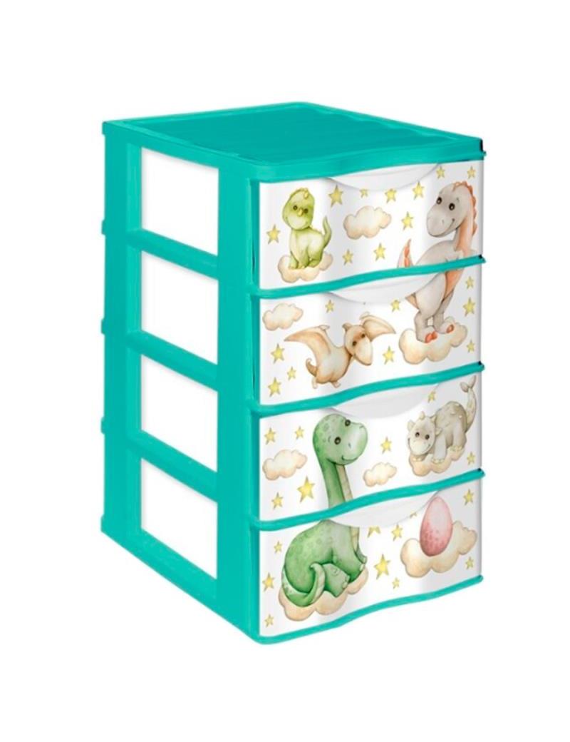 Preciosa cajonera infantil de 4 cajones modelo Wagon Dinosaurios. Sus múltiples cajones permiten guardar varias cosas por separado y clasificarlas por tipo. No solo sirve para almacenar artículos de papelería, sino también para guardar juguetes, ropa, etc. Ideal para colocar en la sala de estar, dormitorio o estudio.