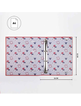 Esta carpeta es de color rojo. El exterior, muestra a Minnie Mouse con unas letras debajo y su interior esta compuesto por un collage de los con distintasa caras de Minnie en color gris. Sus medidas son de 32,1 x 27 x 4 cm (alto x ancho x profundo) y si abrimos la carpeta llega a un tamaño de 32,1 x 56 x 5 cm (alto x ancho x profundo) por lo que será muy cómoda y práctica para todos los días.