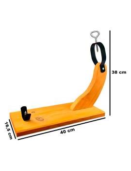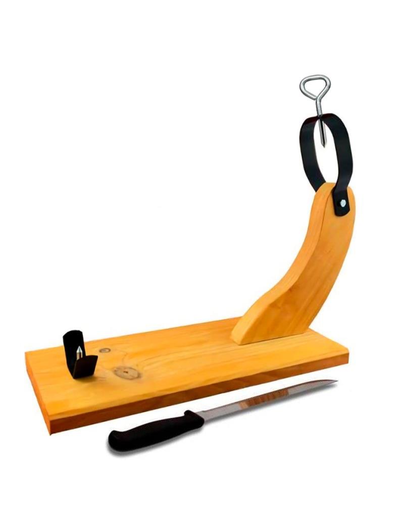Gracias a este estupendo jamonero curvado podrás tener firmemente sujeto el jamón y así poder cortarlo cómodamente con el cuchillo (incluido). La base del soporte está fabricada en madera de gran calidad. Obtendrás un utensilio esencial para conseguir un buen fileteado de jamones o paletas de cerdo.