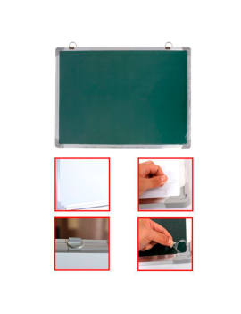 El marco es de aluminio y las esquinas y la bandeja de plástico. La superficie blanca es magnética y sirve para escribir con rotulador de borrado en seco (no incluido) y en la cara verde se puede escribir con tiza (no incluida). Es muy fácil de instalar ya que cuenta con dos arandelas para poder colgarla de la pared. Se incluyen dos imanes y una pequeña bandeja desplegable para poder colocar en ella útiles de escritura, borradores, etc.